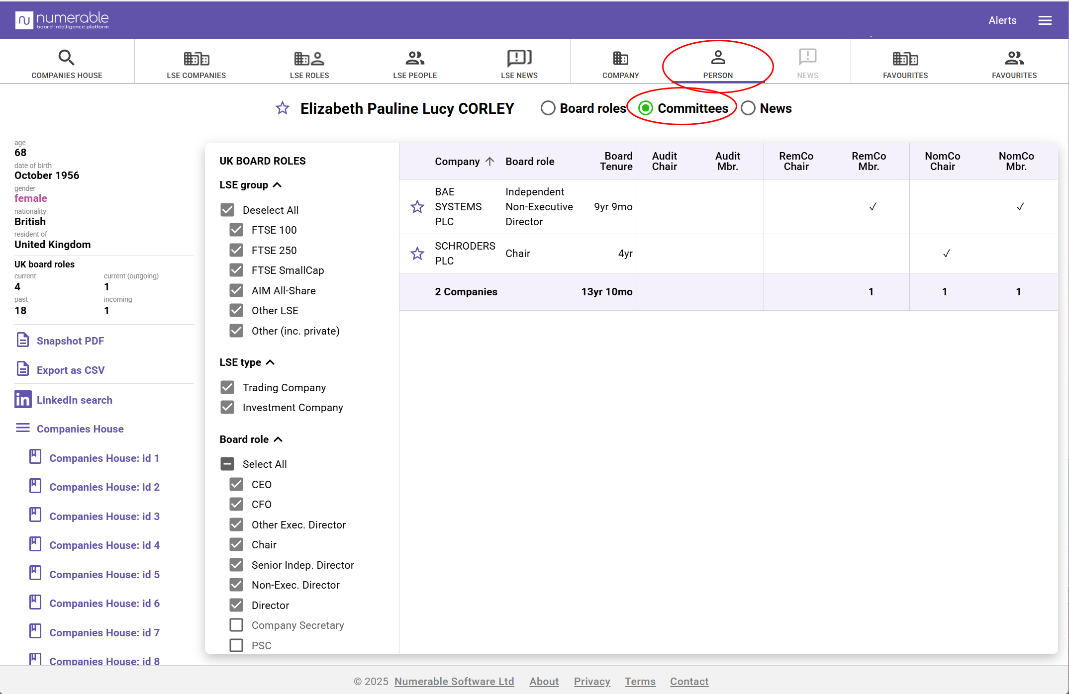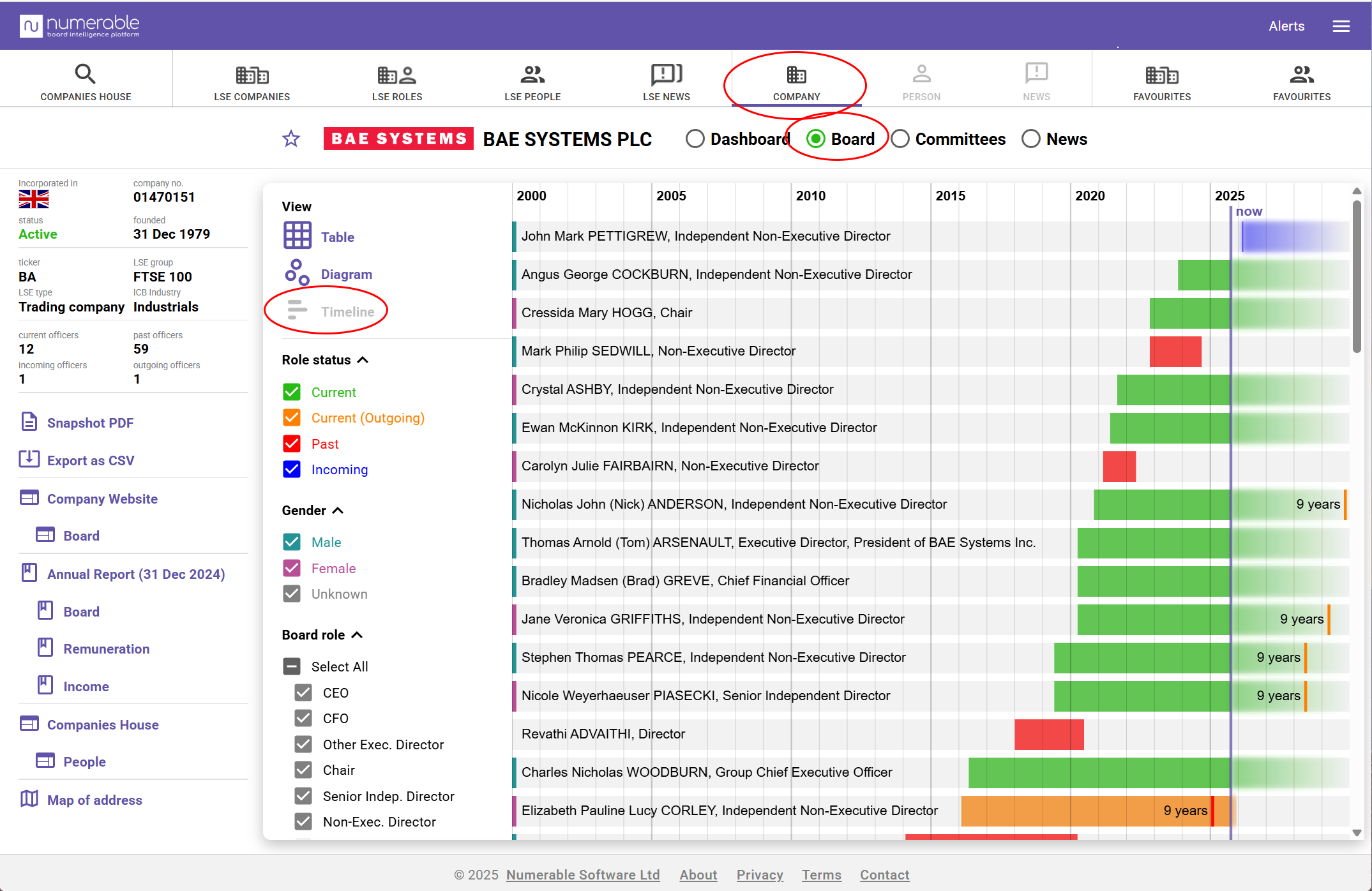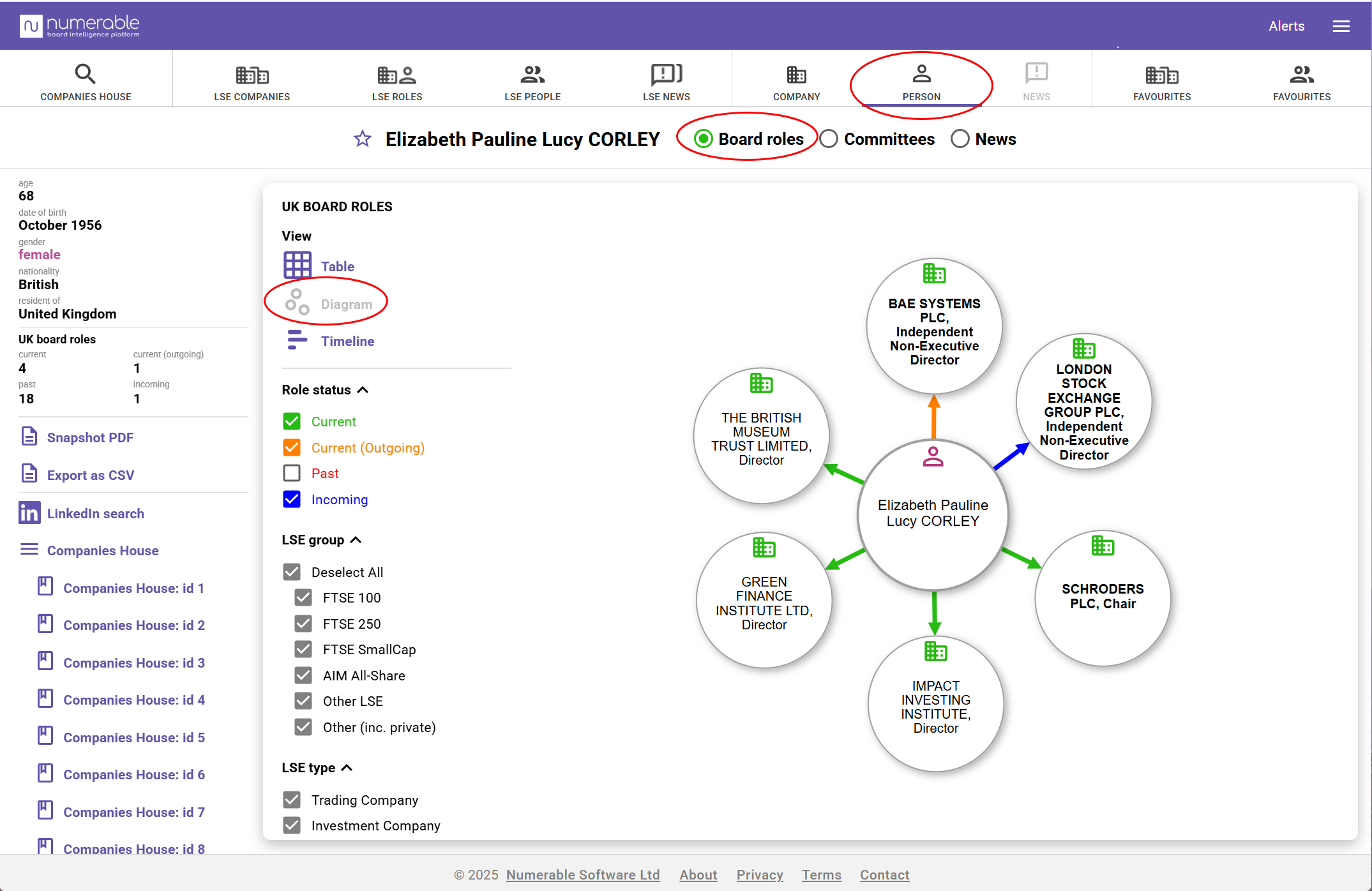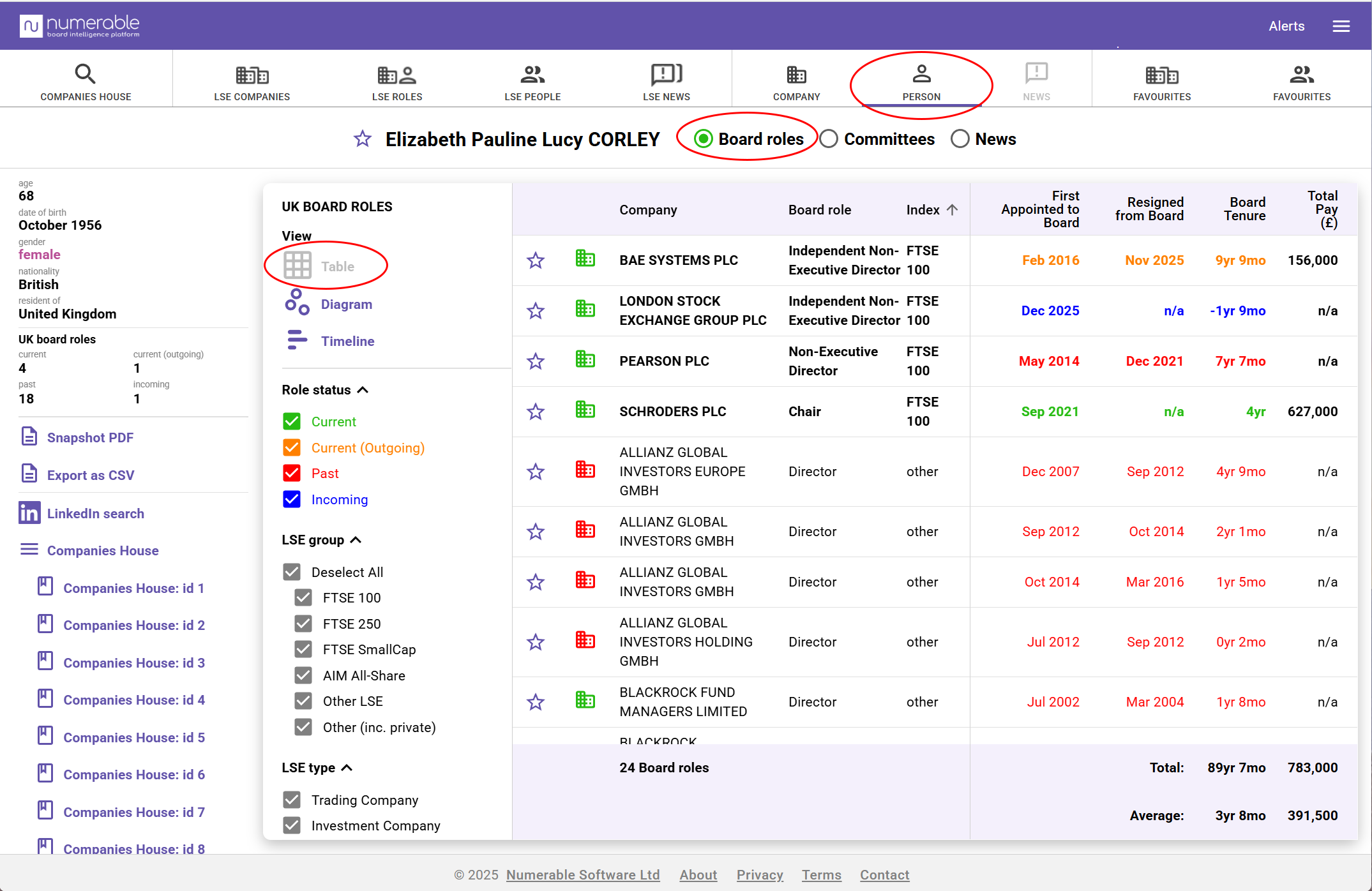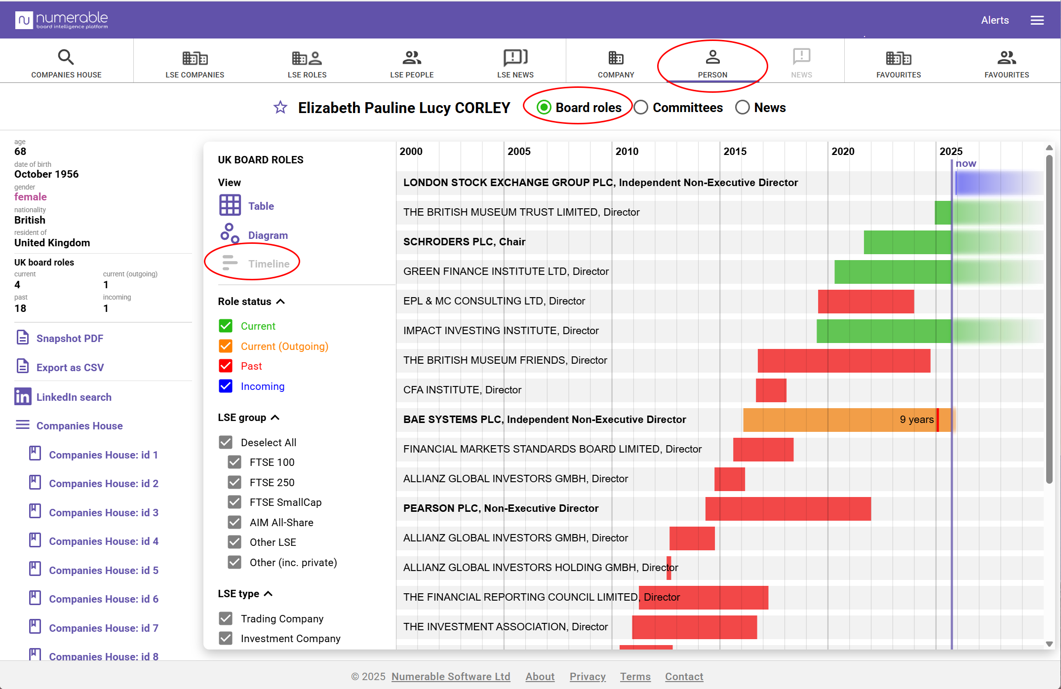 • View the person’s board and PSC roles as a table, connection diagram or timeline
