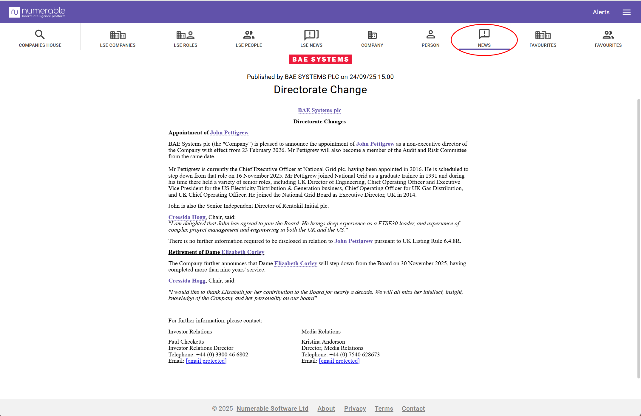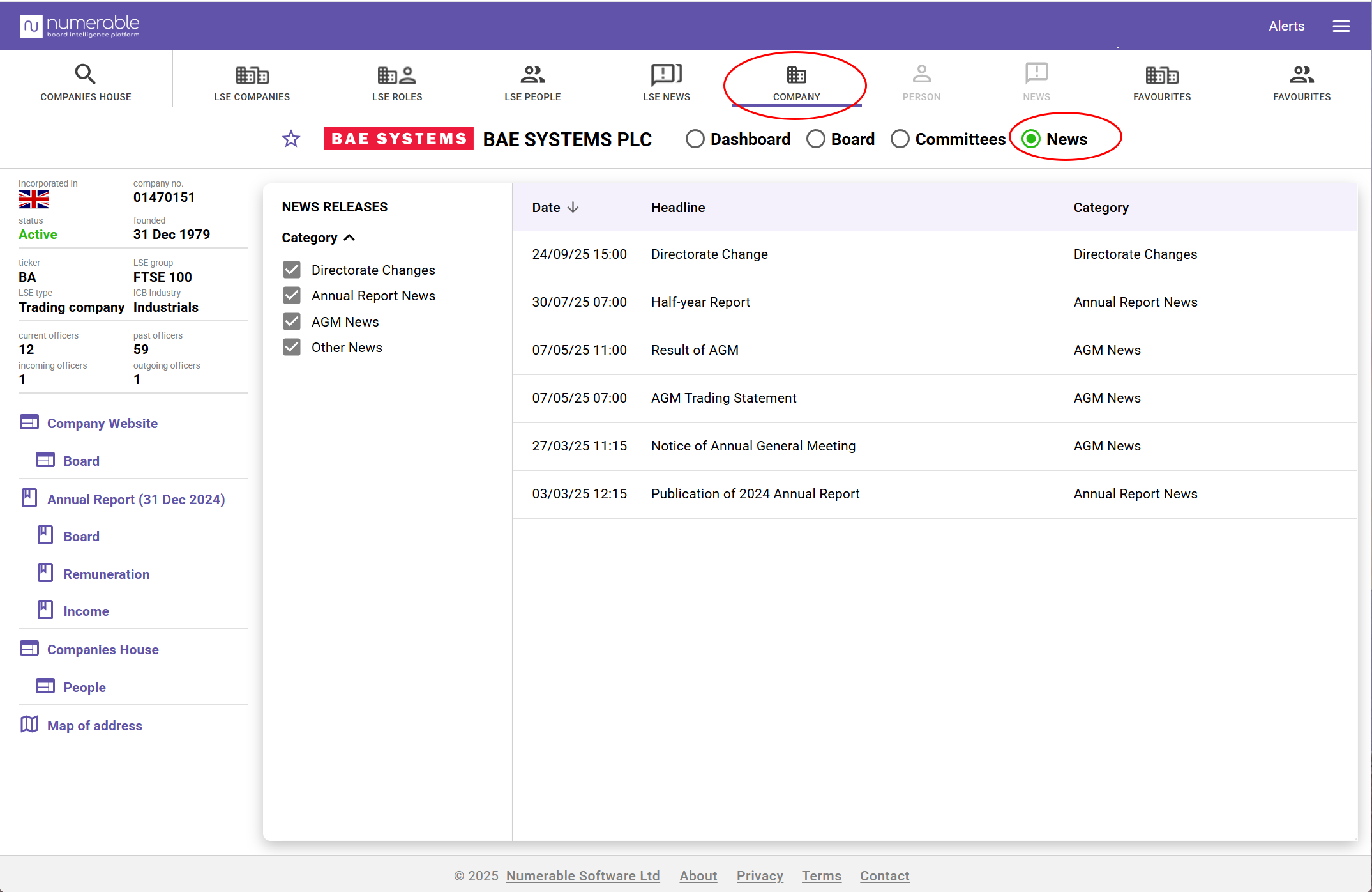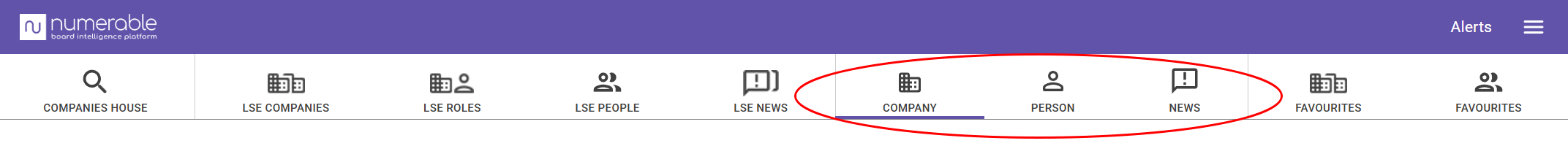 Detailed information on an individual company, person or news release is accessed through 3 tabs: