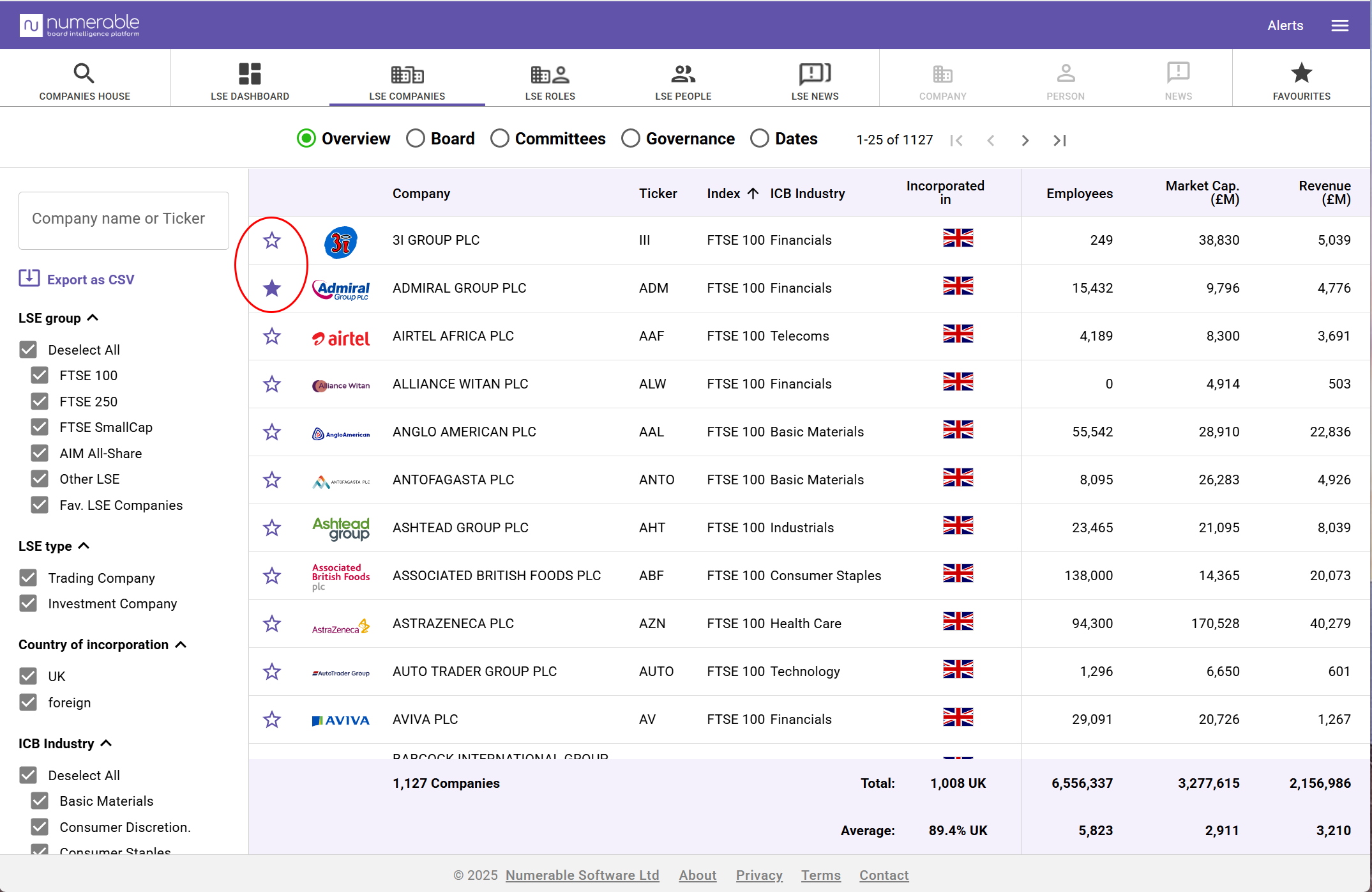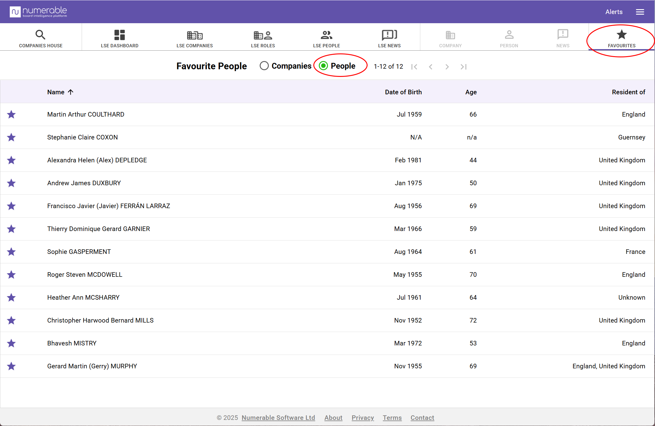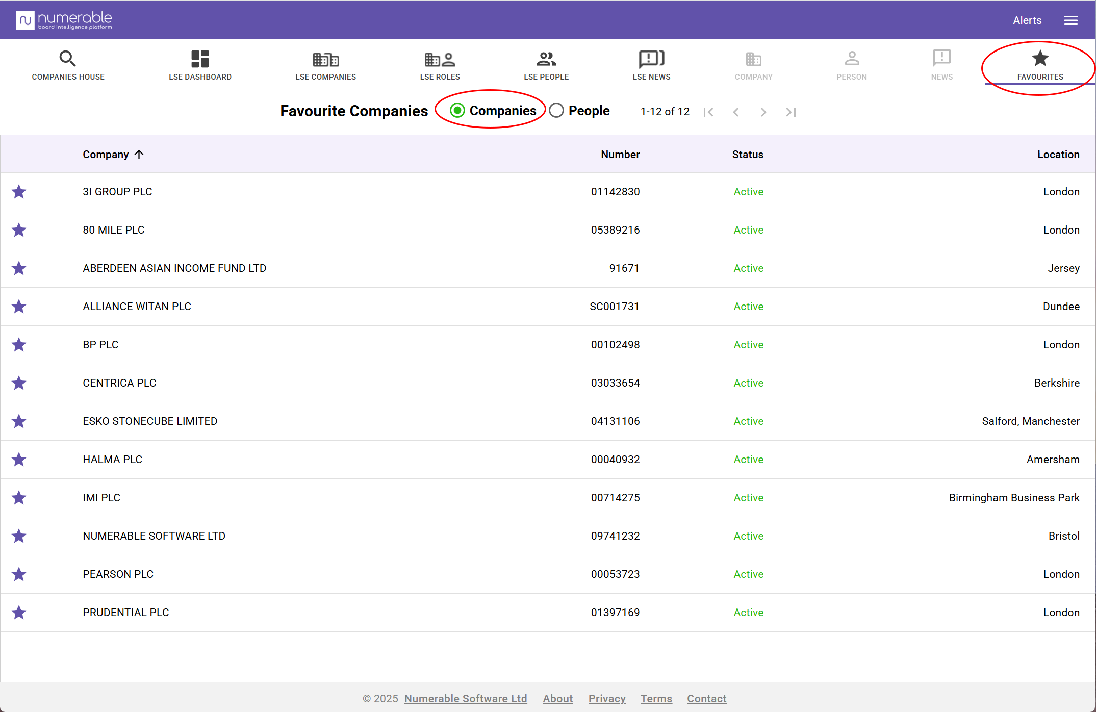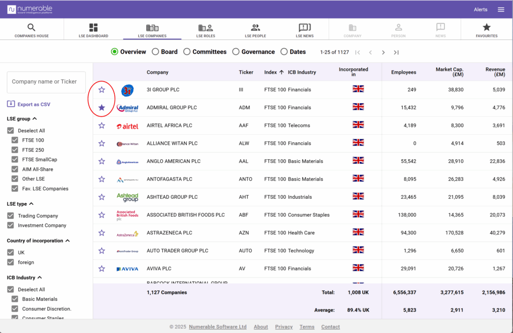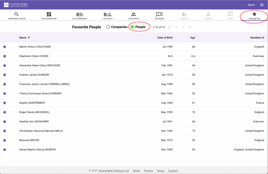 You can save your favourite companies and people to Numerable’s favourite lists.